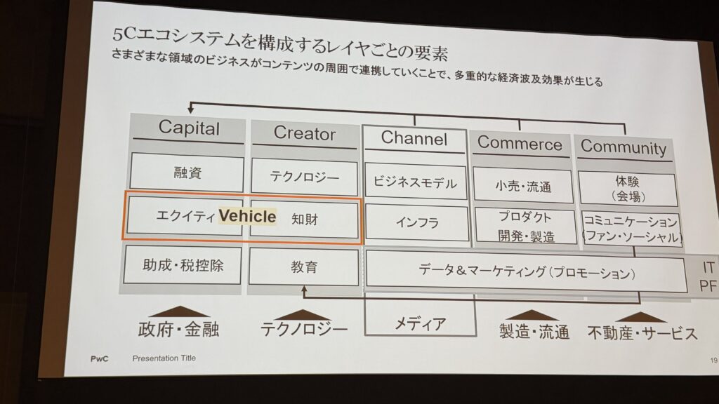 初日、韓国側の参加者が到着する前に、日本側のみが出席して、フォーラム協賛企業であるPwCコンサルティング合同会社の森祐治さんと辻川和希さんによる特別講演「日本コンテンツ産業の成長戦略と海外市場への活路~コンテンツの生態系モデルの提唱」が行われました。ここでは日本のコンテンツ産業を取り巻く構造や課題について、いくつかの視点が提示されました。