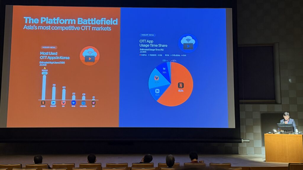 講演の中でも、とりわけ印象的だったのが、NetflixをはじめとするグローバルOTTの影響についての言及でした。Netflixは韓国コンテンツへの投資を急速に拡大し、韓国の映像作品が世界市場へ進出する大きな契機となりましたが、その一方で、この投資拡大は制作費の高騰や人材・機材の集中を招き、放送局の制作現場に空白を生む結果にもつながったといいます。