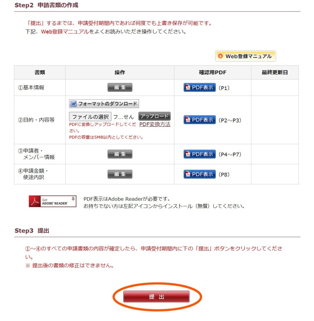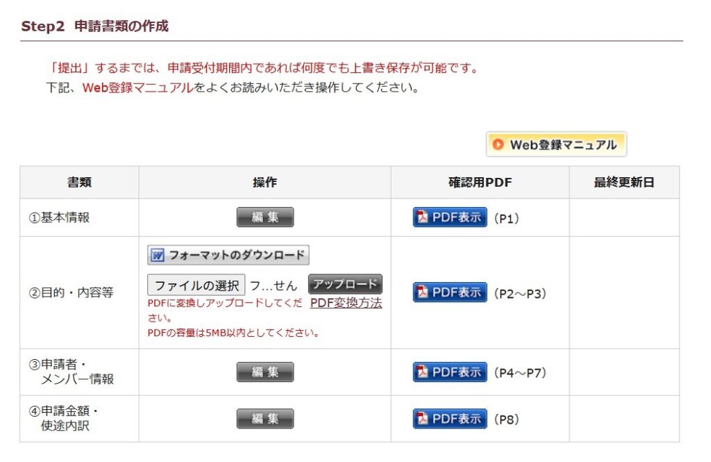 ①基本情報 ③申請者・メンバー情報 ④申請金額・使途内訳の各項目については、「編集」ボタンを押し、入力・保存後に、確認用PDF で内容を確認してください。