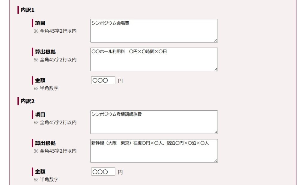 - 項目には費用名を記入し、算出根拠にはその単価・数量・回数など、具体的に記入してください。