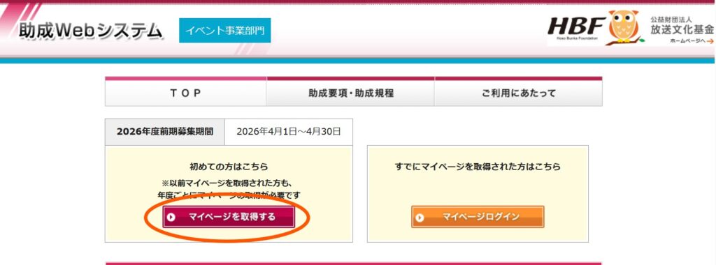 応募にあたっては、助成Webシステムでマイページを取得してください。