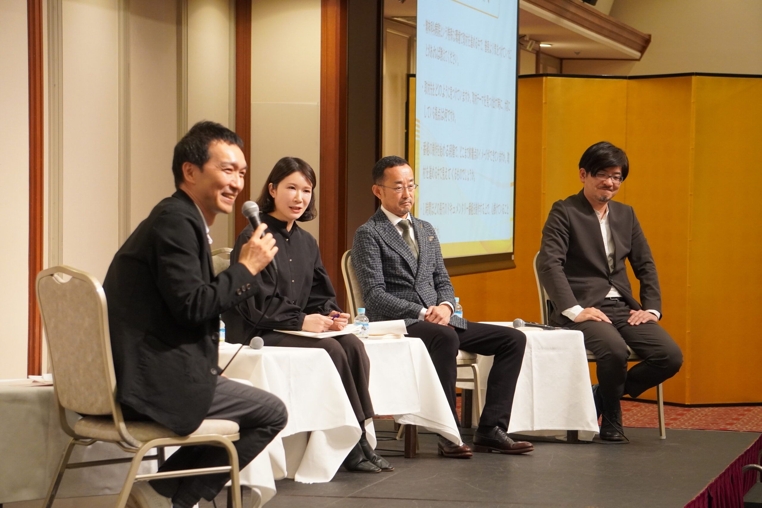 ミニ番組の上映と意見交換の後、事前に参加者から集められた質問をもとにトークセッションが行われました。ゲストには、金川雄策さん(Yahoo!ニュースエキスパートドキュメンタリーチーフ・プロデューサー)、持丸彰子さん(NHK大阪放送局ディレクター)、山下晴海さん(RSK山陽放送報道制作局長)を迎え、コーディネーターとして丹羽美之さん(東京大学教授)が進行役を務めました。