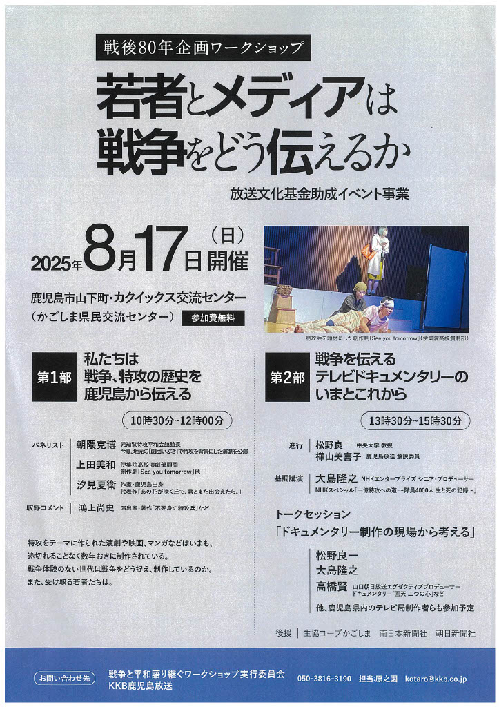 鹿児島放送は昨年末、トークセッション「語り継ぐ戦争と平和 特攻出撃から80年」の動画配信も実施。知覧特攻平和会館で中央大学松野ゼミと伊集院高校演劇部が対話した内容を、地上波でも再編集して放送した。今回のワークショップは10月からYouTubeで配信されており、ぜひ視聴いただきたい。